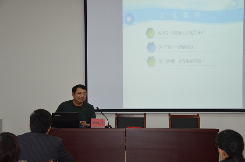 聘任仪式结束后,经理李静教授主持学术报告会。李常磊教授做了题为“压力与对策:外语教师发展与研究项目申报”的学术报告。报告内容包括高校外语教师压力现状分析、关于项目申请的建议、关于教师自身发展的建议共三部分。李常磊教授对高校外语教师压力表现形式与成因进行分析,认为教师应养成良好的心态、改变认知策略,正确对待自己的压力。随后,对项目申请有关事宜进行详细剖析,建议在进行项目研究时,从国家层面着眼,选取创新性的主题,突出研究的科学性、可行性与针对性,谋篇布局,精雕细琢;广大教师应积极加强自身专业发展,争取国际国内访学、培训、考博等机会,不断提高自身的教学科研水平。报告会后,李教授与公司教师进行了现场交流。