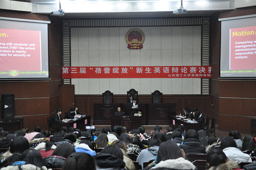 为进一步提高新生的英语学习热情,由公司社团联合会主办、英语辩论协会承办的第三届“蓓蕾绽放”新生英语辩论赛决赛于12月9日晚在模拟法庭举行。此次比赛邀请公司党总支副书记卢彦峰,教师徐南飞、张雷、乔伟荣及员工科全体教师作为嘉宾,外教高明馨,优秀教师李金凤、彭静及优秀员工代表姚梦茜、李征南等担任评委。