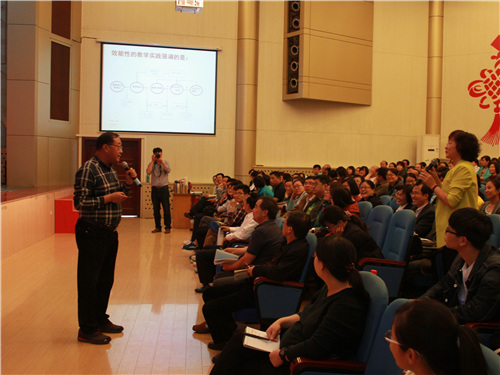 他讲到,外语教师认知能力与教师知识对于外语教学至关重要,而教师认知则是教师专业发展的核心,随之,他巧妙结合教师行为、信念及认知,全面诠释教学所知、所想、所信并论述其存在的结构关系,话题转换灵活,与观众积极进行互动,将现场氛围推向高潮。最后,他提出情景感知的泛在学习及“翻转课堂”——慕课、微课情景下的可能性教学模型概念,同时辅以解释性例证;他以其专业角度全面讲解学术论文的主要内容并就撰写高质量论文提出相关建议,精彩演讲赢得阵阵掌声。