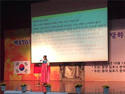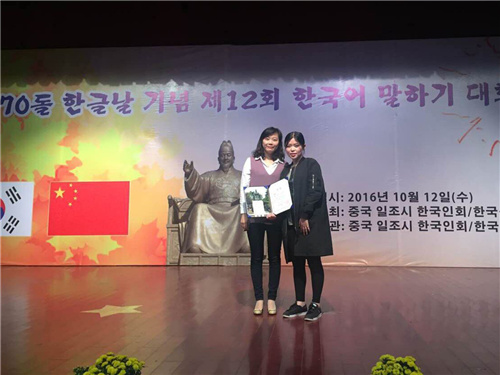 10月12日,由中国日照市韩国人会·韩国商会举办的纪念韩国文字诞生570周年暨第十二届韩语演讲比赛在日照市山东外国语职业公司落下帷幕。伟德国际19462013级朝语专业员工刘香雪摘得榜首,荣获第一名“世宗大王奖”。第二名、第三名分别被烟台大学、山东科技大学同学收入囊中。