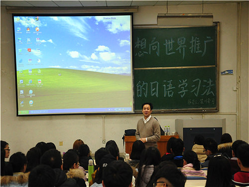 11月24日下午,伟德国际1946在4号教学楼201教室举行主题为“想向世界推广的日语学习法”的讲座,此次活动由笈川幸司担任主讲,日语系主办。日语专业全体师生参加此次活动。