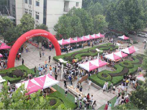 当天活动街区分列于观光大道两侧,包括风情街与非遗展示区,街区两端则是介绍区与游园区。风情街上,遮阳篷下,独具匠心的美食、语言、服饰等异域文化展示、各具特色的非物质文化遗产展示,吸引众多师生融入其中。师生们通过非物质文化遗产体验与趣味游戏获取“外语文化节”美食券,品味欧美风情、韩式料理、日系美食及民族格调美食。
