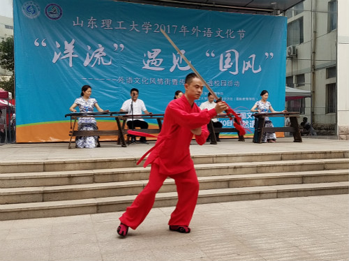 由沃盥、同牢、合卺等组成的汉代婚礼展示、“莲素”汉服表演中,绰约多姿的女子、儒雅风流的儿郎,穿梭历史时空而来。现场观众在中西文化的碰撞中感受民族文化韵味,领略外文魅力。古琴悠扬,瑜伽舒缓,非物质文化遗产“齐鲁琴歌”传承人曹玉梅,联袂现年62岁的空中瑜伽专业教练高素兰,带领观众们进行一次心灵旅行。张店区文化馆的教师们则带来一场旗袍走秀《荷香旗韵》,湖光潋滟,荷叶田田,曼妙身姿时隐时现,风情在婉约中摇曳。以剑和歌,世界功夫武术师范级七段、淄博市文化研究院经理汪峰,横剑如游龙穿梭,纵剑似鹞子翻身,与幽远琴声合成《卧龙吟》一曲。外国院公司员工也为开幕式献声,深情演绎多首外文歌曲,从经典英语曲目《Hey Jude》到甜美声线下的日文歌曲《Secret Base》,更有吉他伴唱的韩语歌曲《你不要担心》,青春嗓音迸发出年轻力量,火花四溅。