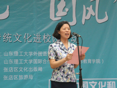 李新红此次活动致辞,简介风情街在外语文化节中的重要作用,开拓员工视野,感受异域文化的独特魅力。她更对张店区文化出版局、旅游局表示衷心感谢,指出此届风情街活动增加了“传统文化进校园活动”,让广大师生在不同文化元素的融汇交流中得到艺术熏陶与享受,提升了青年人民族文化自豪感与自信心。