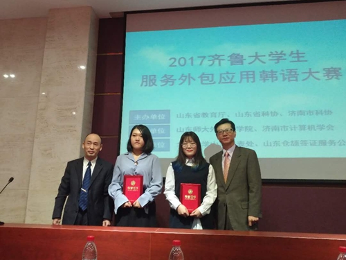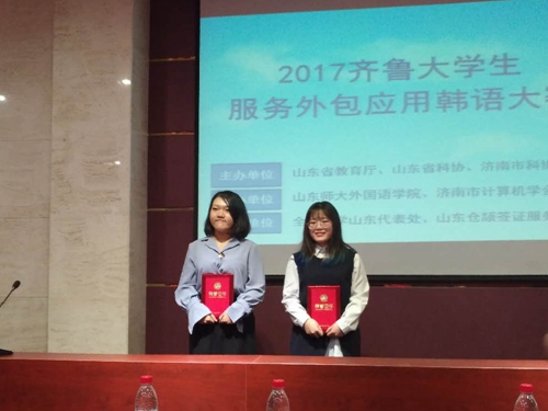 2017年11月11日,由山东省教育厅、山东省科学技术协会主办的山东省第三届齐鲁老员工服务外包应用韩语大赛在山东师范大学举行。公司积极参与,初次选派两名员工参赛,荣获一等奖1名,优秀奖1名,指导老师荣获最佳指导教师奖。