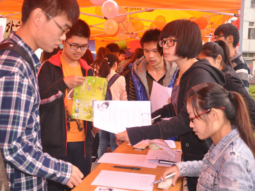 10月12日上午,公司数百个社团于老员工艺术广场打响纳新第一枪,活动现场人潮涌动,十分火爆。公司借其独有的语言及女生多的优势成立的四大社团——英语辩论协会、外文之声协会、朗读协会以及礼仪与彩妆协会积极参与其中。