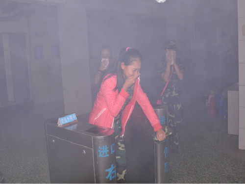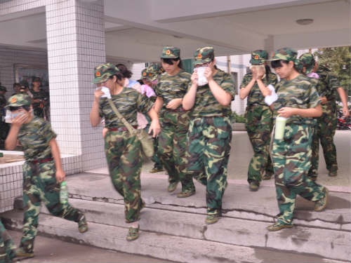 9月12日早上,3、4号公寓楼响起响亮的哨子声,公司14届新生应军训期间安排,开始火灾紧急疏散演练。一楼预定放烟雾的同学点燃烟雾弹以模拟火灾现场,顿时浓烟四起,全体军训员工紧张有序的往预定地点集合。