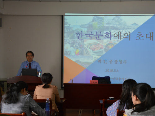 5月8日下午,韩国驻青岛总领事馆总领事朴镇雄一行来访我院,公司经理王明新、副经理于志涛、韩语系系主任董娟热情接待来访,韩语系教师、韩国职工及韩语系员工参加活动讲座。