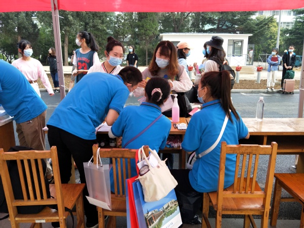 伟德国际1946的各位领导和老师早早在此准备,辅导员邢琛老师在返校报到点组织了员工志愿者帮助新同学搬运行李;校园公交“小绿龙”来往奔波,把员工送到所在公寓。身穿“研究生院”字样蓝色体恤的学长学姐早早来到迎新现场,一个个身影穿梭在报到处与宿舍楼之间,传递外院情谊。各位学长学姐井井有条地收取、核验新生证明文件,同时发放校园卡、新生入学须知等重要文件,悉心指导,耐心解答新生问题。每一位员工都会经过手部消毒,各位学长学姐和老师更是全程佩戴口罩,严格按照公司的防疫要求办理报到程序。虽然流程冷静高效,但当学长学姐拎起新生行李的那一刻,我们就成为了一家人。