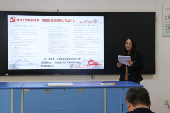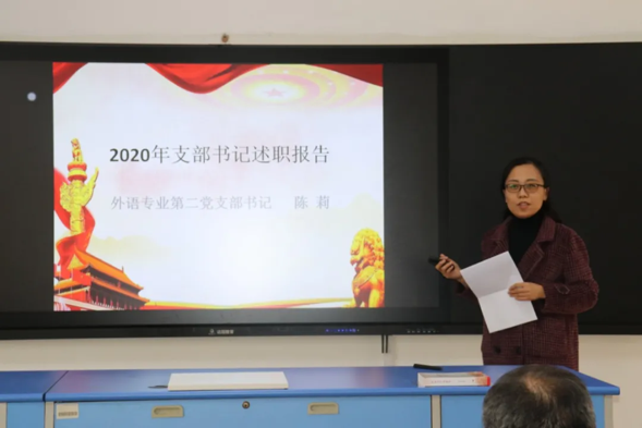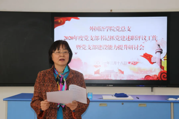 会议第一阶段进行党支部书记抓党建述职评议工作。外语专业第一党支部、外语专业第二党支部、大学英语第一党支部、大学英语第二党支部、员工第一党支部、员工第二党支部的6位支部书记紧扣党建责任履职和党建重点工作,重点从学习贯彻习近平新时代中国特色社会主义思想和党的十九大及历届全会精神、提升支部规范化建设、推进课程思政建设、落实意识形态工作责任制、党建和业务相结合、党支部战斗堡垒作用发挥等方面,汇报履职尽责的工作情况,并深刻查摆、剖析了工作中的不足和问题,提出改进思路和整改措施。