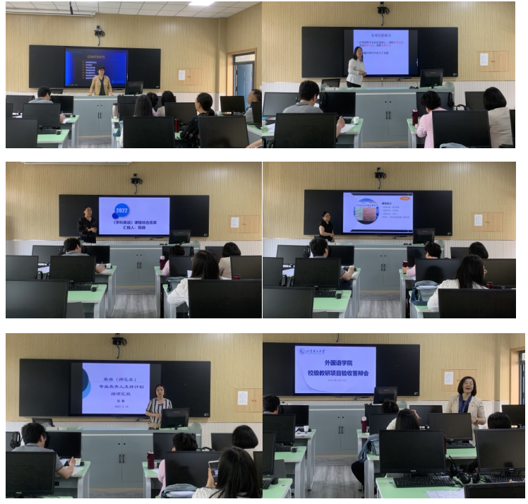 在216教室课程建设项目结项验收答辩会上,李金凤、徐秀梅、陈丽、沙仲辉、彭静5位老师依次汇报项目开展情况,她们从课程团队建设、教学大纲修订、教学方法革新、考核方式改革、课程建设成效、课程推广与应用等方面对所主持的项目进行了详细汇报,王晓华教授对课程建设项目结项汇报进行了点评。