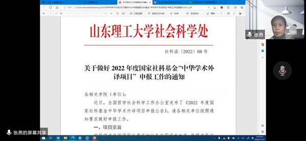 11月21日晚,伟德国际1946中华学术外译项目申报解读工作会通过腾讯会议线上召开。张燕副经理主讲,英、日、韩、德、俄各语种符合申报条件的教师参加了会议。