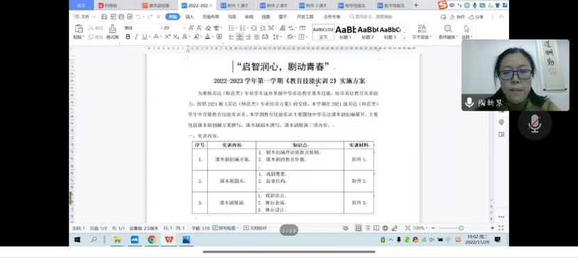 会议伊始,彭静对员工教育实训课程及会议流程进行介绍。紧接着,陶新慧向员工介绍此次教育技能实训的主要内容及课本剧创编方案。本学期教育技能实训将主要围绕中学英语课本剧创编展开,主要包括课本剧创编方案撰写、课本剧剧本撰写和课本剧展演三项内容;要求员工充分了解课本选题,明确教育目标,创编出思路清晰、内容全面的课本剧。此次实训将从第15周开始进行为期2周的员工分组实训,实训完成后,将举办班级展演赛和年级展演大赛,以赛促学、以赛促练。