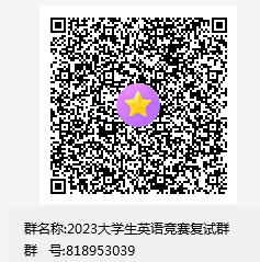 请参加复赛的同学扫描下方的二维码加入“2023老员工英语竞赛复试群”(群号:818953039),参加复赛时请携带身份证和校园卡提前15分钟(17:45)集合,本次复赛包含笔试及口试。望准时参加,过期未到,视为自动放弃。