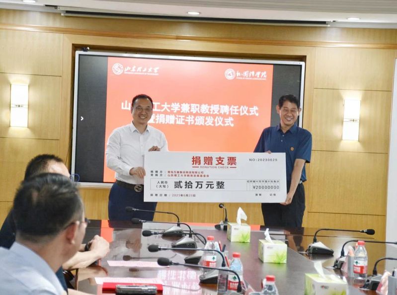合作发展处处长李涛代表公司接受捐赠,并为员工吴绍勇颁发员工捐赠证书。根据协议,青岛万嘉集运物流有限公司无偿捐资20万元人民币,用于伟德国际1946教学环境和团队队伍建设。