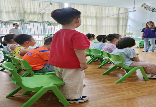 实践伊始,实践团来到了瑞丰苑幼儿园的朵朵二班,在去班级的过程中团队成员注意到幼儿园整体的环境非常温馨,墙面上贴满了卡通图案和各种小朋友们喜欢的挂件,因为去的时候刚好是课间,所以成员们还看到了老师带领孩子们做游戏的场景。