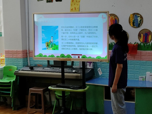 正式授课阶段,实践团派出两名成员轮流授课,以PPT授课的方式先给孩子们讲了几个红色小英雄的感人事迹,生动展示了共产党员们为了民族独立和人民解放而做出的英勇奋斗的场景。孩子们听得津津有味,纷纷对革命先烈们的英勇事迹表示敬佩和赞叹。实践团成员还通过阅读经典的红色文化作品,让孩子们感受到革命先辈们的坚定信仰和无私奉献精神。接着过渡到中国传统艺术表演----皮影戏,并给他们放了一段皮影戏版的美猴王三打白骨精,孩子们看得全神贯注。期间主讲人提出了一些小问题让小朋友们来作答,孩子们很是配合,争先恐后地举手回答。最后,实践团成员又以“我心目中的英雄”为话题,引导孩子们用画笔和白纸,画出自己心中的那位英雄。在画画阶段,实践团成员与孩子们一同作画,利用丰富的想象力和动手能力完成了一幅幅美丽的画作。