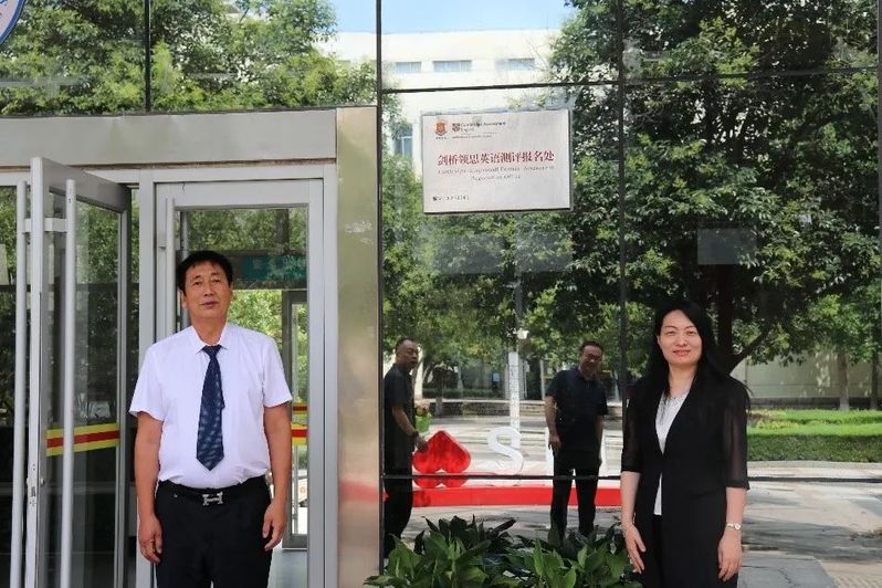 会后,举行揭牌仪式。庞秋香与姜福成共同为剑桥领思伟德国际1946考点揭牌。