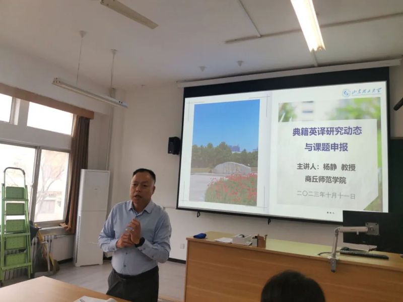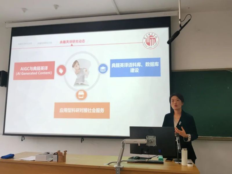 副经理张燕首先简要介绍了杨静教授的工作经历和科研成果。随后,杨静教授从典籍英译研究历程、研究分类和研究热点三个方面进行了剖析。她着重梳理了我国典籍集中翻译出版情况,并指出中国古代典籍具有强阐释性,其英译研究对于提升中国传播力和影响力至关重要。