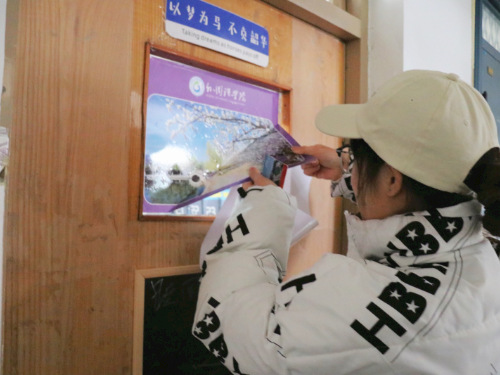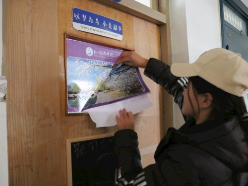 活动筹备期间,公司组织带领员工拍摄校园内风景,并挑选打印,张贴在教学楼的教室门窗上。活动开展过程中,员工兴致高昂,积极参与,展现了昂扬向上的精神状态和良好的志愿服务精神。教室门窗上的标语、照片既提高了员工的审美能力,又起到良好的育人作用。