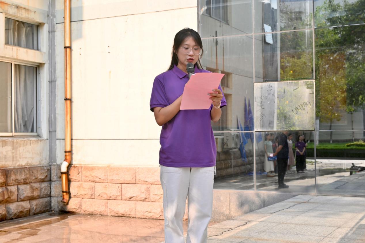 仪式进行第二项,王楠作为实践团代表发言,她从宏观到微观深刻阐述了社会实践对青年老员工的重要性。她呼吁各位同学在实践中把各环节做细做实,在平凡处落笔,在带队老师的支持和指导下,遵守纪律,克服困难,团结协作,全力以赴,力争圆满地完成预定的各项实践任务。