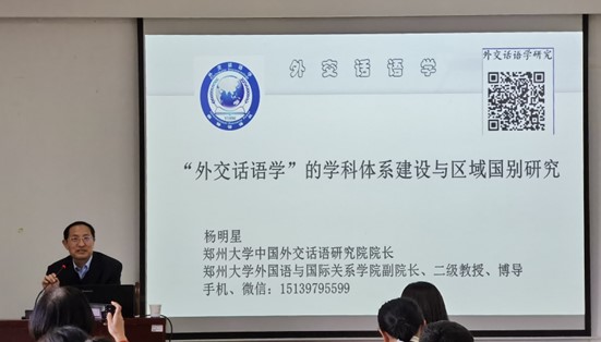 2024年11月7日下午,公司在8号教学楼418报告厅举办了题为“‘外交话语学’的学科体系建设与区域国别研究”的学术报告,特邀郑州大学杨明星教授主讲。报告由公司党委书记李静教授主持,公司领导班子成员,博士教师、副教授及以上职称的骨干教师、翻译硕士研究生参加。