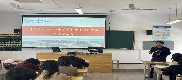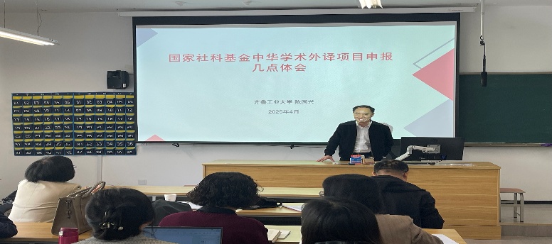 随后,陈国兴教授作了中华学术外译项目申报经验分享的专题报告。陈教授结合自身丰富的申报经验,从申报条件、团队组建、样章翻译、出版社联系等关键环节进行了深入浅出的讲解,他着重强调,项目申报应始终坚持学术价值与社会效益协同并重的原则,既要确保外译成果具备扎实的学术根基与研究深度,也要考量其在促进中外文化交流、提升中华文化国际影响力方面的实际效能,为老师们提供了极具指导意义的申报思路与实践策略。