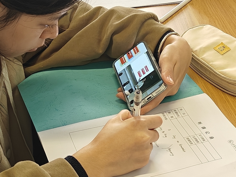 观课过程中,全体员工专注投入,一边跟随直播节奏记录教师的课堂环节设计和学情反馈技巧,一边在手册留白处写下即时思考和待解疑问,字里行间满是对教学实践的深度探索,形成“眼随课动、手随思记、脑随学转”的良好观课氛围,切实将直播课中的教学感受转化为书面反思,为下一阶段的持续性讨论和学习积累素材。