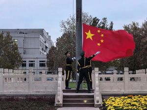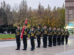 升旗仪式第一项。国旗护卫队身着挺拔制服,迈着铿锵矫健的步伐,昂首挺胸护送五星红旗稳步入场。庄严的《义勇军进行曲》奏响,护旗手凝神聚力、振臂挥展,鲜艳的国旗顺着旗杆冉冉升起,在晨光中舒展飘扬。现场全体人员肃立静立,目光追随着五星红旗,行注目礼.